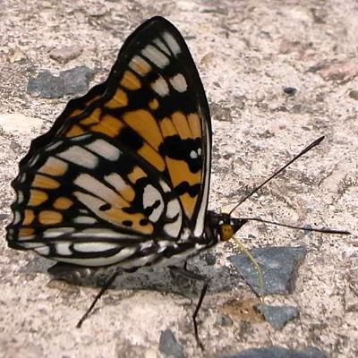 날개 편 길이 55~70mm. 수컷은 암컷에 비해 크기가 작고 뒷날개는 안선두리뿔이 발달하였으나, 암컷은 크고 안선두리뿔이 없다. 수컷은 검정색 바탕에 적등색 무늬가 있고 암컷은 검정색 바탕에 흰색무늬가 있다. 앞날개의 가운뎃방과 뒷날개의 앞선두리에 있는 무늬들은 등황색이다.