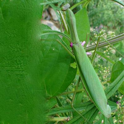몸길이 70~95mm. 몸이 크고 녹색 또는 갈색이며, 사마귀와 비슷하나 뒷날개를 펴면 몸쪽부분으로 자주색이 도는 갈색무늬가 있다. 더듬이는 다른 종보다 길고, 앞가슴의 뒤쪽은 앞다리 밑마디보다 조금 길다. 앞다리는 포획다리로 발달되어 있으며, 밑마디의 아래에 16개 이상의 짧은 가시가 있고 넓적다리마디의 아랫바깥가두리에는 4개, 아랫가두리에는 약 17개의 가시가 있으며 중간가시는 4개인데 둘째 것이 특히 길고 크다.