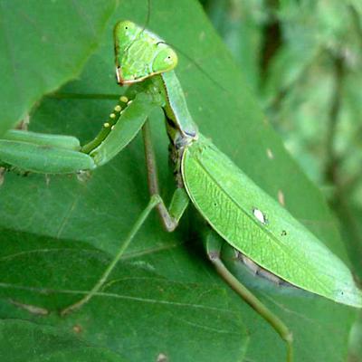몸길이 40~70mm. 몸 색깔은 주로 녹색이며 드물게 갈색도 있다. 몸길이에 비하여 머리와 앞다리가 크고 전체적으로 땅딸막해 보인다. 앞날개에 한 쌍의 흰색 반점이 있고, 앞다리의 밑마디는 길쭉하며 앞가장자리에 3~4개의 황색 돌기가 있다.