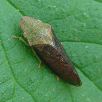 몸길이 11~14mm. 암컷이 훨씬 더 크다. 몸은 살아 있을 때 황록색 또는 초록색이지만, 죽은 표본에서는 황갈색 또는 어두운 황색을 띤다. 등에는 가루모양의 작고 적갈색의 혹들이 있다. 머리는 앞가슴등판보다 좁고 주걱처럼 넓적하고 길다. 이마의 가장자리가 붉다. 앞가슴등판의 양측 뒷모서리는 편평한 세모꼴로 크게 튀어나와 있다.