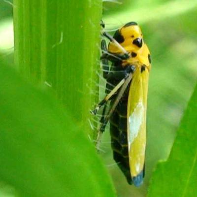 몸길이 11.0~13.5mm. 매미충류 중에서는 아주 큰 종에 속한다. 몸의 등은 살아 있을 때 광택을 띤 황록색을 띠지만, 죽으면 주황색으로 변한다. 몸의 아랫면과 다리 끝은 검은색을 띤다. 앞가슴등판에는 3개의 검은 점이 삼각형으로 있다. 앞날개의 끝은 검은 띠를 특징적으로 가진다.