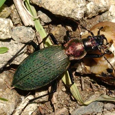 몸길이 25~40mm. 몸 색깔은 머리, 앞가슴등판과 딱지날개의 가두리는 적동색이나 딱지날개는 녹색을 띄는 검은색이고 앞가슴등판까지 완전히 녹색인 개체도 있다. 머리는 길고 앞머리는 주름살 무늬가 많다. 딱지날개에는 점무늬가 많이 있고, 막질의 뒷날개는 퇴화되어 비행력을 상실하였다.