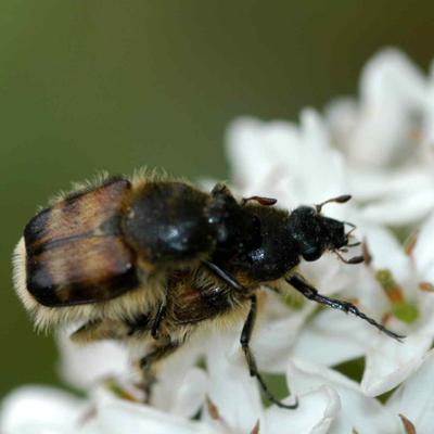 몸길이 8∼13mm. 몸은 검은색인데 전신에 황색 털이 빽빽하게 나 있고, 딱지날개에는 3개의 황색 가로무늬가 있다. 머리방패 앞쪽 가운데는 파였고, 옆은 아래로 굽었다. 딱지날개에는 노란색 털이 촘촘히 나 있고, 표면에는 흑갈색의 넓은 띠무늬가 3줄 있으며 날개 끝에 있는 것이 가장 넓다. 수컷의 배는 마지막 마디가 짧고 꼬리판은 좁고 길며 가운데가 높으나, 암컷은 배가 부풀었고 마지막마디는 넓고 길며 꼬리판은 둥글다.