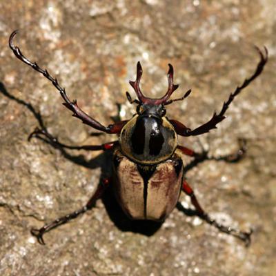 몸길이 22mm 내외. 몸의 빛깔은 검은색이나 앞가슴등판과 딱지날개 대부분이 회백색의 가루로 덮였고, 앞가슴등판 위에 2개의 큰 세로띠와 딱지날개의 어깨부분과 끝에 작은 검은색 얼룩무늬가 있다. 암컷은 가루가 적거나 없으며 띠무늬도 없고 전체적으로 흑갈색 또는 적갈색이다. 머리는 검은색이고 겹눈 가장자리를 따라서 회백색 얼룩무늬가 있다. 수컷은 머리 앞쪽에 1쌍의 사슴뿔 모양의 돌기가 있고 그 끝은 강하게 위쪽으로 구부러졌다. 또 수컷은 앞다리의 발목마디가 특히 길지만 암컷은 돌기도 없고 발목마디도 짧다.
