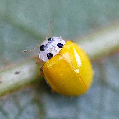 몸길이 3~5mm. 머리와 등가슴은 흰색바탕에 각각 1쌍의 검고 둥근 무늬가 있다. 크기가 매우 작으며, 딱지날개는 전형적인 노란색을 띠는 것으로 다른 무당벌레들과 쉽게 구별할 수 있다.