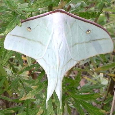 날개길이 100~110mm. 수컷의 더듬이는 깃털 모양이나, 암컷은 빗살 모양이다. 뒷날개 뒷부분이 긴 꼬리 모양을 하고 있는 것이 특징이다. 날개는 청백색 또는 옥색을 나타내며 몸쪽에는 많은 흰색 털이 있다. 앞날개의 앞가두리는 암자색을 띠며 그 앞에는 흰색 비늘이 섞여 있다. 앞뒤날개의 가운데방 끝에는 노란색 또는 담황색의 둥근 무늬가 있는데, 이 무늬는 검은색의 테두리와 그 중앙에는 투명한 부분이 있다.